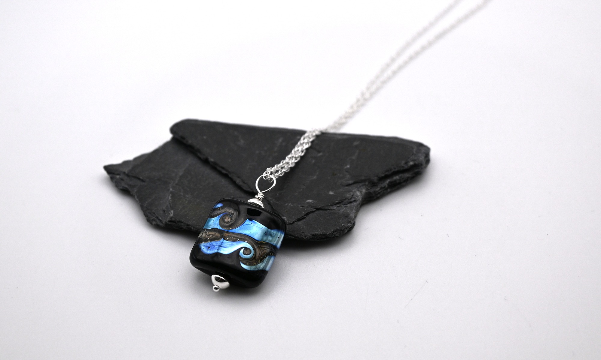 I make glass jewellery using a process called lampworking, this involves melting a rod of glass in a propane and oxygen flame. I shape the glass when molten to form beads and once made I put them into my kiln to anneal for strength and durability.